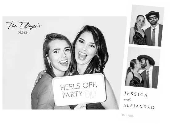 This is our Classy B&W Photo Booth Experience. It includes everything from Party Pix Booth PLUS It's enhanced by our glam skin smooth filter that makes everyone in the photo look fabulous.